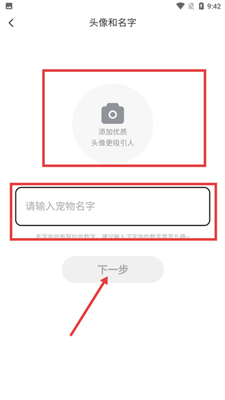 4、在頭像和名字頁面,添加寵物頭像、輸入寵物名字后點擊【下一步】,繼續(xù)完成寵物檔案的創(chuàng)建操作。