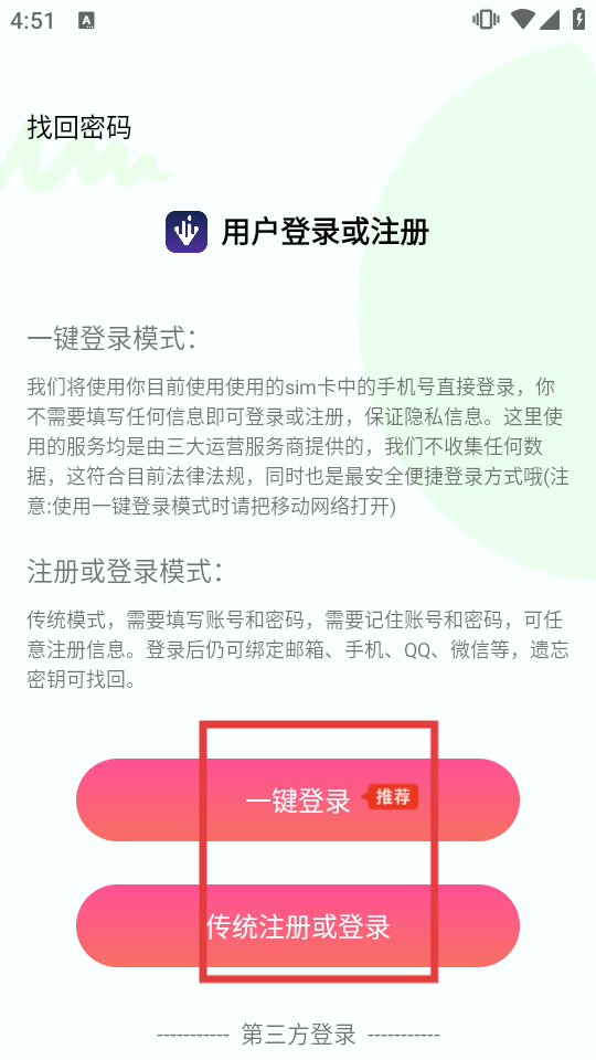 4、在登錄頁面,可選擇【一鍵登錄】或【傳統(tǒng)注冊或登錄】,完成登錄操作。