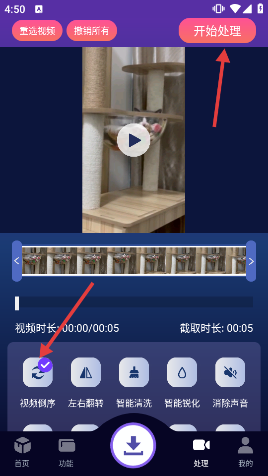 3、選擇【視頻倒序】功能,點擊【開始處理】,完成視頻處理操作。
