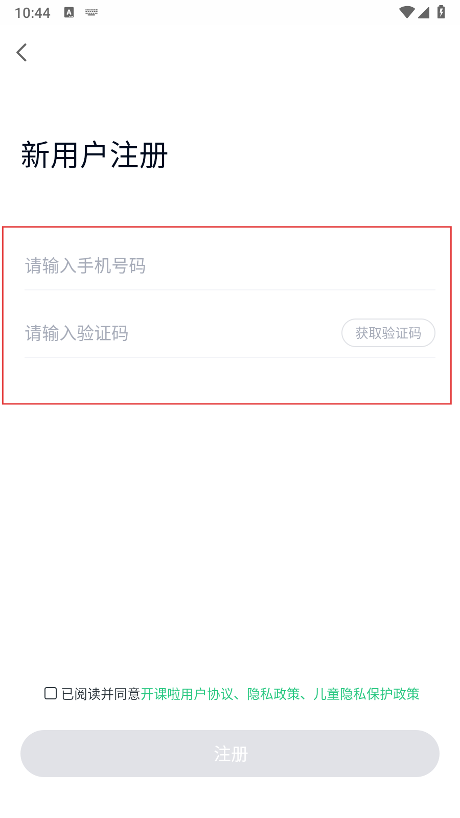 4、在新用戶注冊(cè)界面,輸入手機(jī)號(hào)碼,點(diǎn)擊【獲取驗(yàn)證碼】,輸入收到的驗(yàn)證碼后點(diǎn)擊【注冊(cè)】,即可完成注冊(cè)流程。