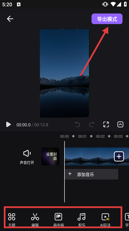 3、在視頻編輯頁(yè)面點(diǎn)擊【導(dǎo)出模式】,進(jìn)入導(dǎo)出設(shè)置頁(yè)面。