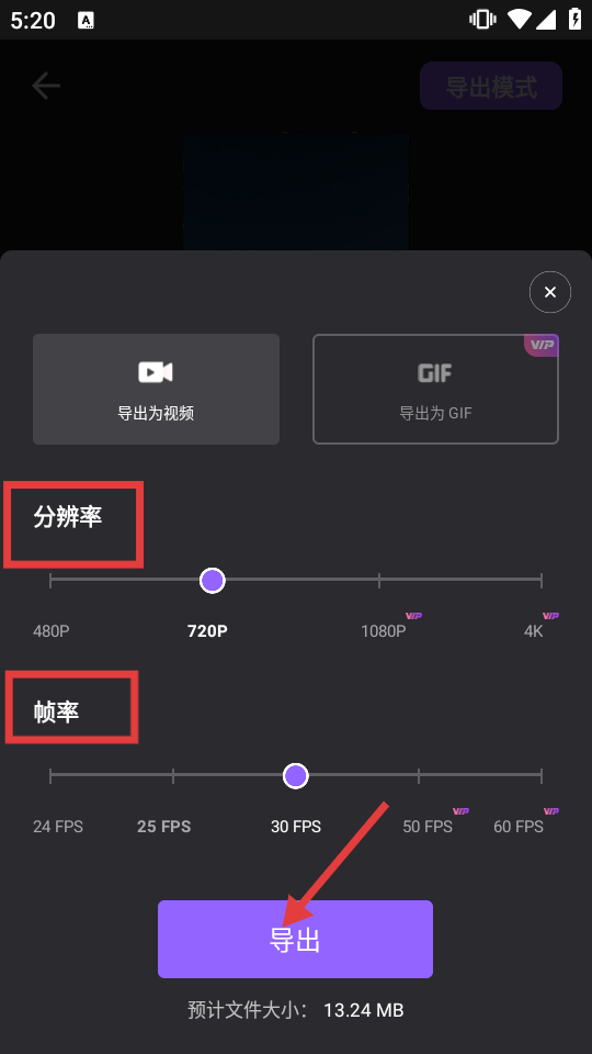 4、在導(dǎo)出設(shè)置頁(yè)面設(shè)置分辨率、幀率后,點(diǎn)擊【導(dǎo)出】,完成視頻導(dǎo)出操作。