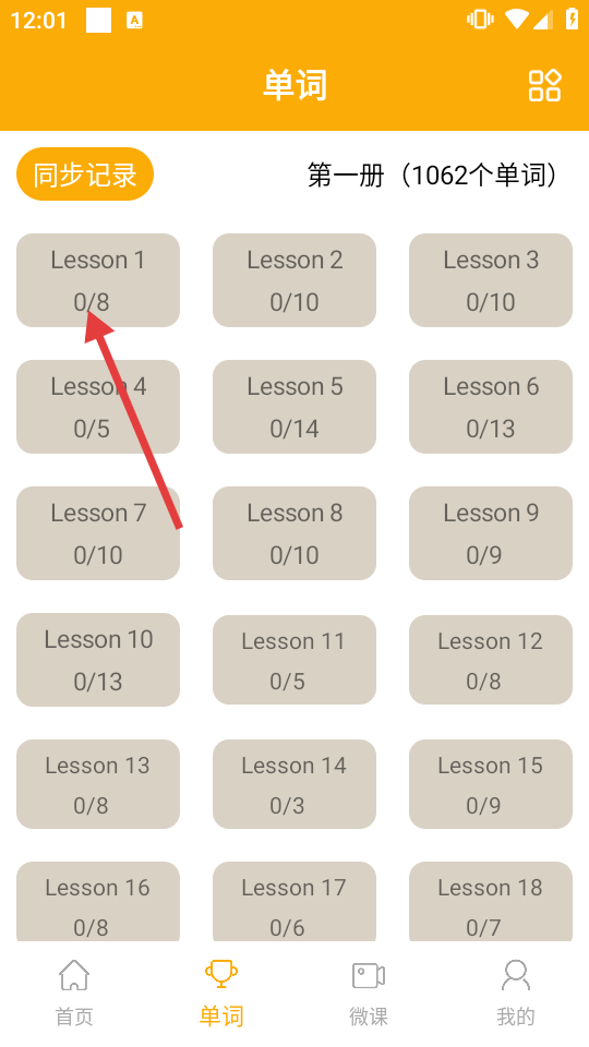 2、在單詞學(xué)習(xí)頁(yè)面選擇【Lesson1】,進(jìn)入該課單詞列表頁(yè)面。