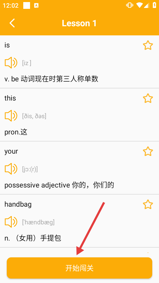 3、在單詞列表頁(yè)面點(diǎn)擊【開(kāi)始闖關(guān)】,進(jìn)入單詞闖關(guān)頁(yè)面。