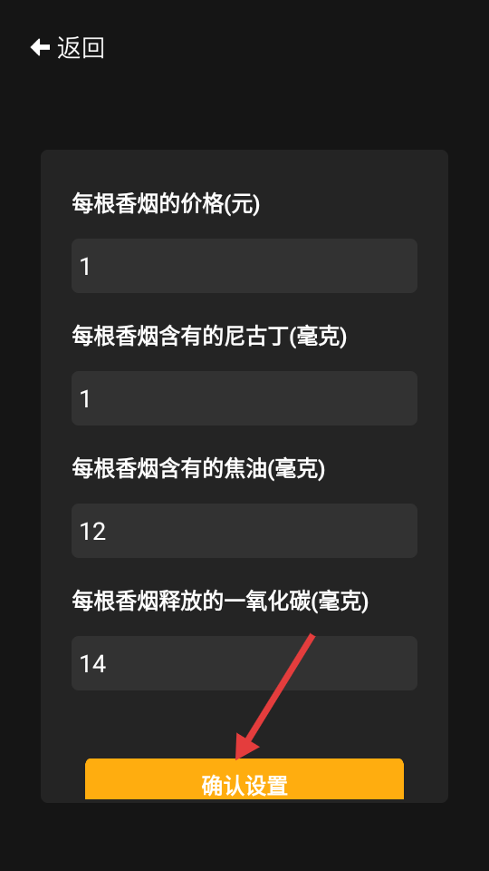 4、在APP設(shè)置頁面設(shè)置每根香煙的價(jià)格、尼古丁含量等信息后,點(diǎn)擊【確認(rèn)設(shè)置】,完成APP設(shè)置操作。