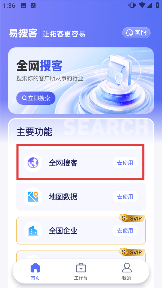 1、點(diǎn)擊【全網(wǎng)搜客-去使用】,進(jìn)入全網(wǎng)搜客頁(yè)面。