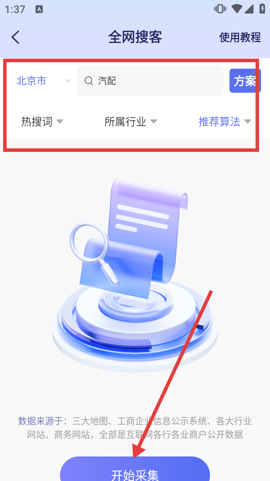2、在全網(wǎng)搜客頁(yè)面設(shè)置地區(qū)、關(guān)鍵詞等條件,點(diǎn)擊【開(kāi)始采集】。