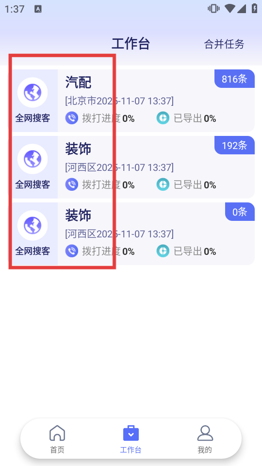 4、點(diǎn)擊底部【工作臺(tái)】,查看已采集的任務(wù)。