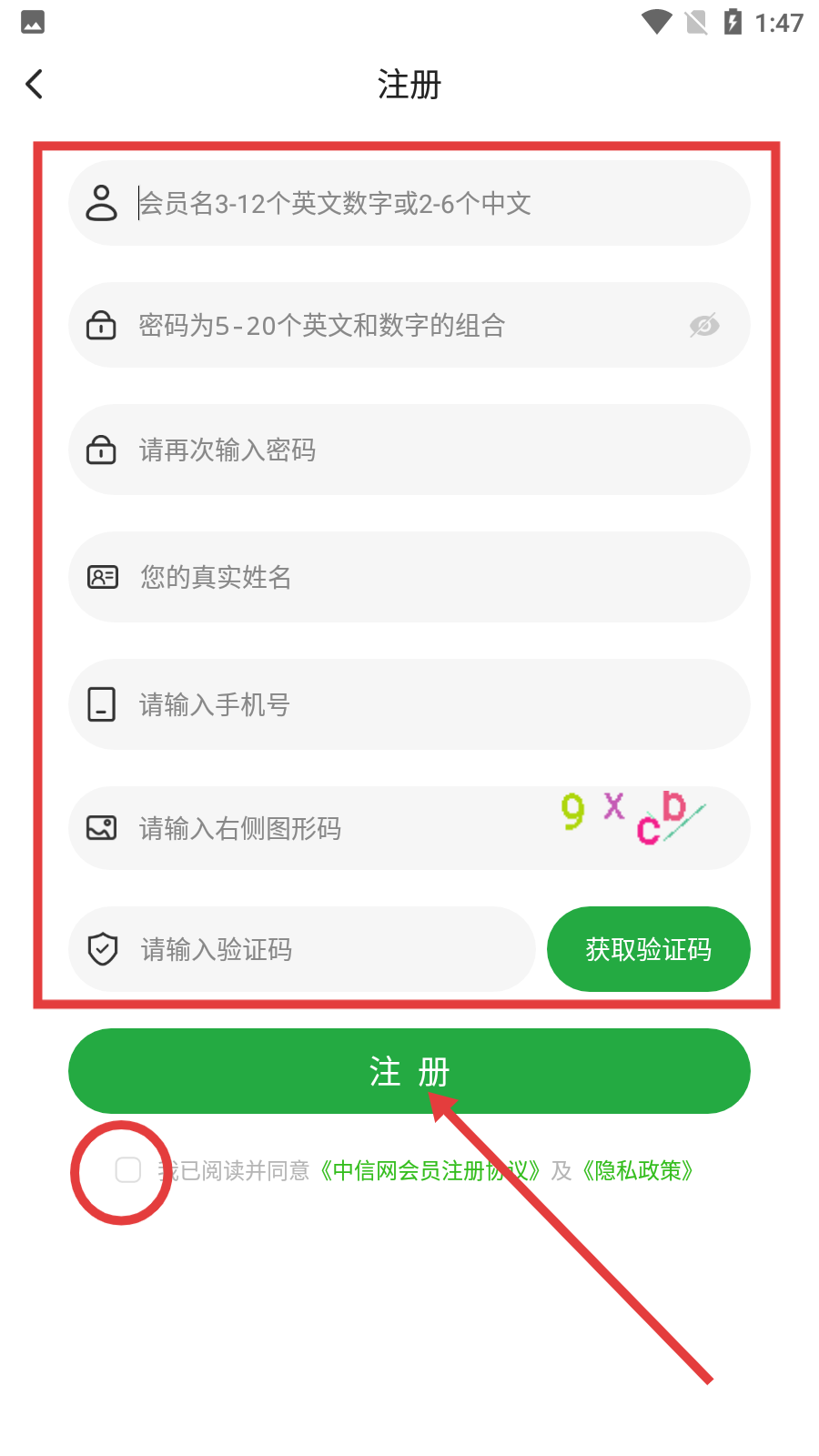 4、在注冊頁面依次填寫會員名、密碼、真實姓名等信息,勾選同意《中信網(wǎng)會員注冊協(xié)議》及《隱私政策》后點擊【注冊】,完成注冊流程。