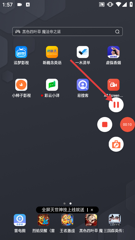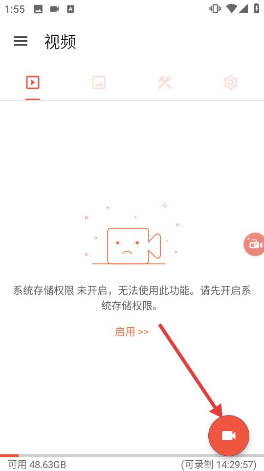 1、點擊錄屏按鈕,若提示系統(tǒng)存儲權(quán)限未開啟,先開啟權(quán)限后再點擊錄屏。