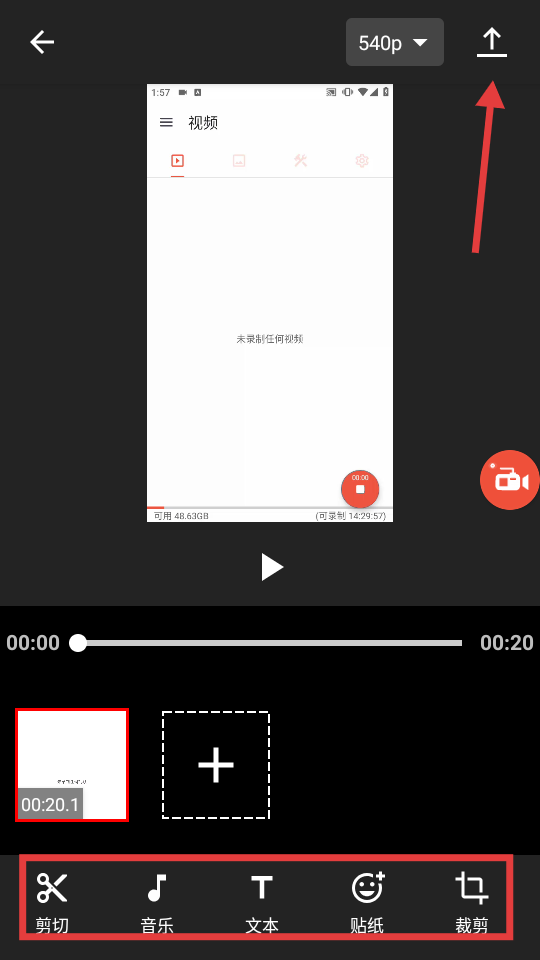 4、在視頻編輯頁面可使用剪切、音樂、文本等功能,或點擊分享圖標分享視頻。