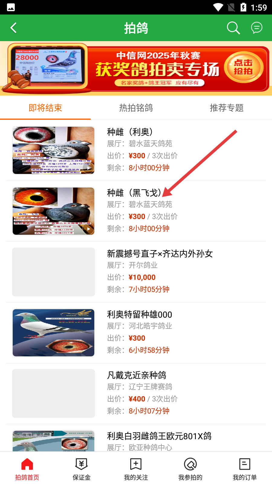 3、在拍鴿頁(yè)面選擇目標(biāo)拍鴿商品,進(jìn)入商品詳情頁(yè)面。