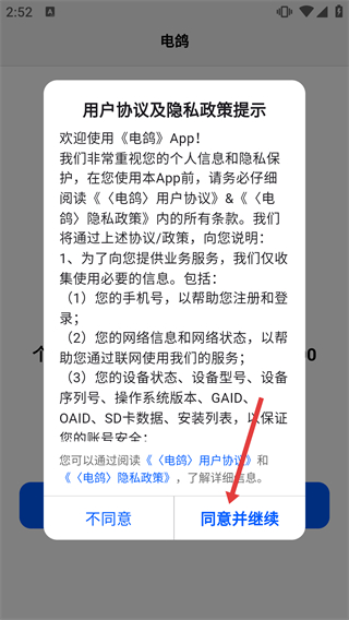 1、在“用戶協(xié)議及隱私政策提示”彈窗中點(diǎn)擊【同意并繼續(xù)】,進(jìn)入登錄頁面。