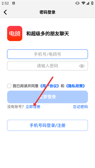 2、在密碼登錄頁面點(diǎn)擊【立即注冊(cè)】,進(jìn)入手機(jī)號(hào)登錄/注冊(cè)頁面。