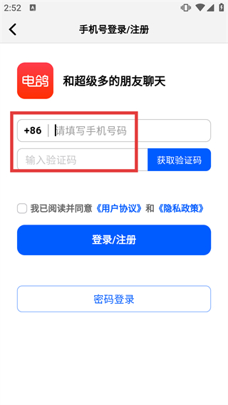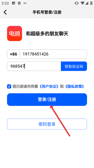 4、勾選“我已閱讀并同意《用戶協(xié)議》和《隱私政策》”后,點(diǎn)擊【登錄/注冊(cè)】,完成賬號(hào)注冊(cè)登錄,可使用電鴿APP的聊天等功能。