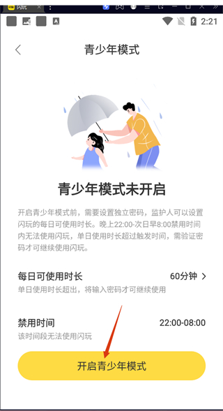 4、在青少年模式頁面點擊【開啟青少年模式】,即可開啟該模式,開啟后可設(shè)置每日使用時長和禁用時間。