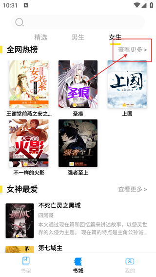 1、在書城頁面選擇【女生】分類,點擊【查看更多】可進入對應榜單頁面,能瀏覽該分類下的熱門小說,如【全網熱榜】類作品。