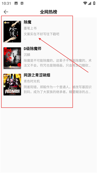 2、進入【全網熱榜】頁面,可查看多本熱門小說的名稱、作者及簡介,點擊目標小說(如【除魔】)即可進入書籍詳情頁。