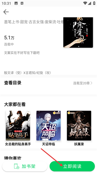 3、在書籍詳情頁,可查看作品的熱度、連載狀態(tài)、主角設定等信息,點擊【立即閱讀】即可進入小說閱讀界面,也可選擇【加書架】收藏作品。