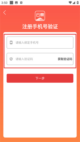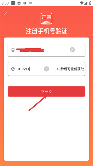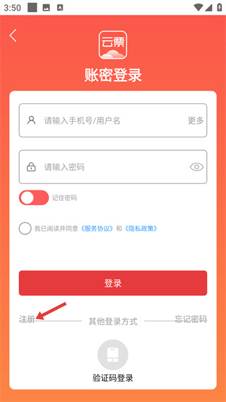 1、進(jìn)入云票APP賬密登錄頁面,點(diǎn)擊【注冊】,進(jìn)入注冊手機(jī)號驗(yàn)證頁面。