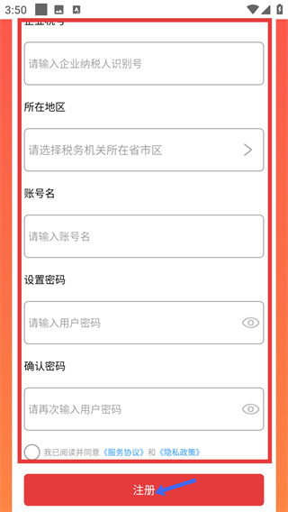 4、在企業(yè)信息填寫頁面,依次輸入企業(yè)納稅人識別號、選擇所在地區(qū)等信息,勾選同意《服務(wù)協(xié)議》和《隱私政策》后,點(diǎn)擊【注冊】,完成賬號注冊操作。