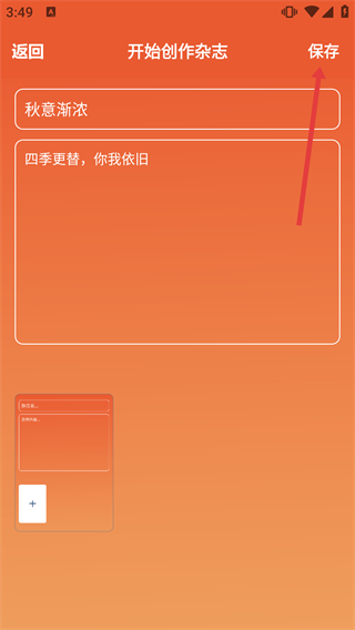 3、在創(chuàng)作編輯頁面,填寫雜志標(biāo)題、內(nèi)容等信息后,點擊右上角【保存】,完成雜志創(chuàng)作的保存操作。