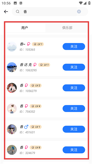 3、在搜索結(jié)果的用戶列表中,瀏覽匹配的用戶信息。