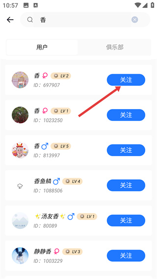4、找到目標(biāo)用戶后,點(diǎn)擊其右側(cè)的“關(guān)注”按鈕,完成用戶關(guān)注操作。