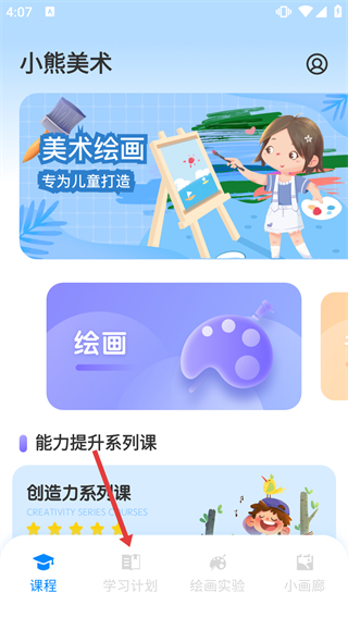 1、進(jìn)入小熊美術(shù)首頁,點(diǎn)擊底部導(dǎo)航欄的【學(xué)習(xí)計(jì)劃】選項(xiàng),進(jìn)入學(xué)習(xí)計(jì)劃的功能頁面。