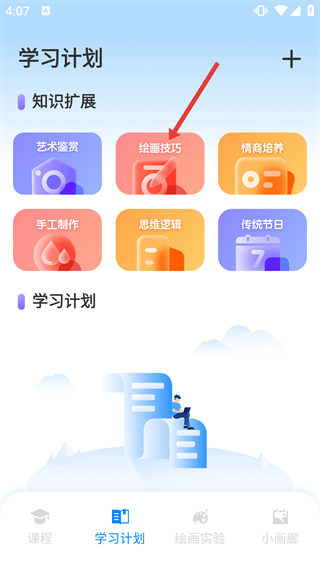 2、在學(xué)習(xí)計(jì)劃頁面,找到【知識(shí)擴(kuò)展】板塊下的【繪畫技巧】選項(xiàng)并點(diǎn)擊,進(jìn)入繪畫技巧的內(nèi)容列表頁面。