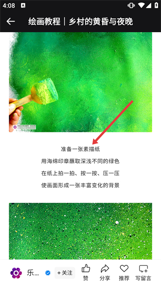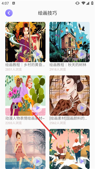 3、在繪畫技巧的內(nèi)容列表中,選擇【繪畫教程|鄉(xiāng)村的黃昏與夜晚】條目,點(diǎn)擊進(jìn)入該教程的詳情頁面。