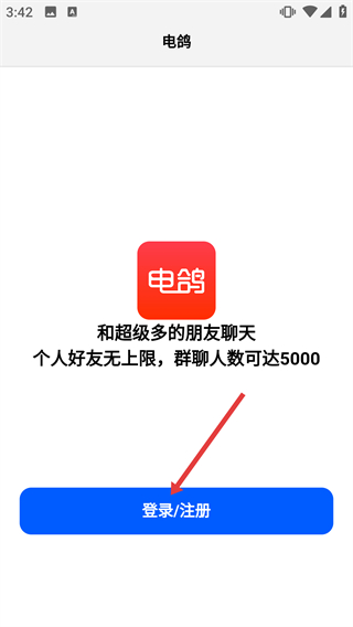 1、進(jìn)入電鴿APP首頁,點擊頁面中的“登錄/注冊”按鈕,進(jìn)入密碼登錄的操作界面。