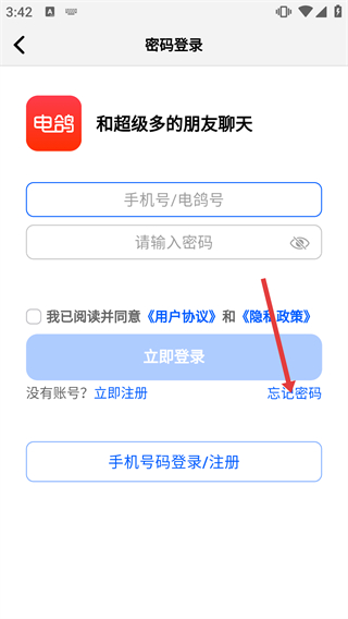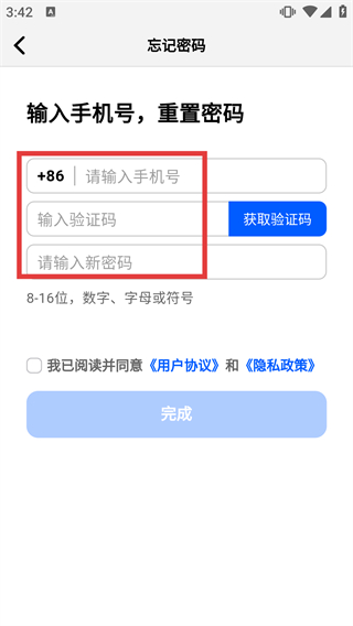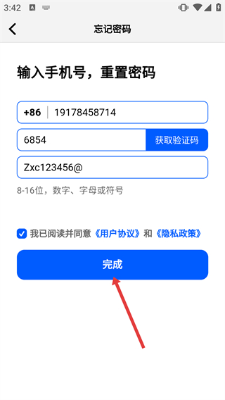 4、勾選“我已閱讀并同意《用戶協(xié)議》和《隱私政策》”選項后,點擊“完成”按鈕,完成電鴿賬號的密碼重置操作。