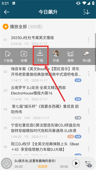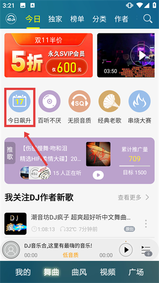 1、進(jìn)入【DJ音樂盒】的今日頁面,點擊【今日飆升】圖標(biāo),進(jìn)入包含多首熱門DJ歌曲的今日飆升列表頁面。