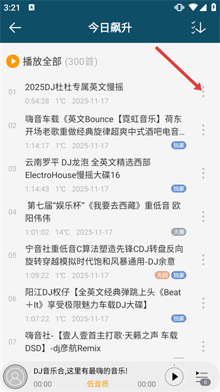 2、在今日飆升歌曲列表頁,點擊目標(biāo)歌曲右側(cè)的更多按鈕,展開該歌曲對應(yīng)的操作選項菜單。