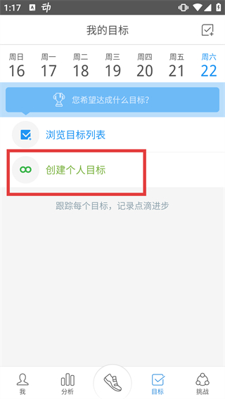 2、在我的目標(biāo)頁面,點(diǎn)擊【創(chuàng)建個(gè)人目標(biāo)】選項(xiàng),進(jìn)入可選擇目標(biāo)類型的添加目標(biāo)界面。