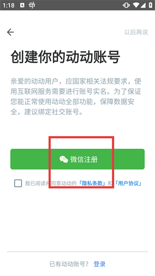 4、在創(chuàng)建動(dòng)動(dòng)賬號頁面,勾選相關(guān)協(xié)議后,點(diǎn)擊【微信注冊】按鈕完成賬號注冊流程。