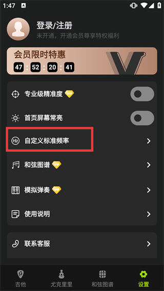 2、進入吉他調(diào)音主界面后,點擊底部導航欄的【設(shè)置】選項,進入包含功能開關(guān)的設(shè)置頁面。
