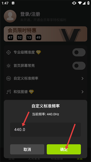 4、在自定義標準頻率彈窗中,可修改當前頻率(默認440.0Hz),調(diào)整后點擊【確定】完成頻率設(shè)置。