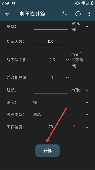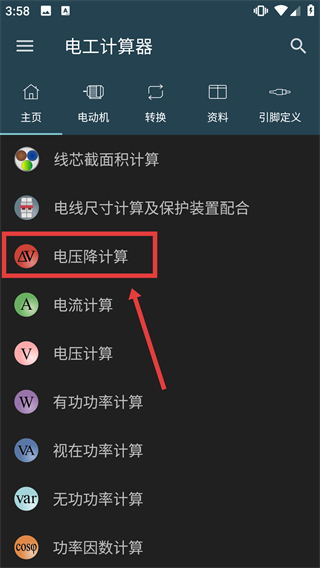 1、在電工計算器的首頁,選擇【電壓降計算】功能選項,進(jìn)入電壓降的參數(shù)設(shè)置與計算頁面。