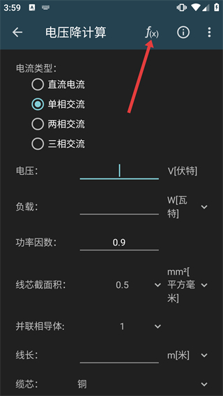 2、在電壓降計算頁面,點(diǎn)擊右上角的【fx】按鈕,可查看電壓降計算公式,以及公式中各參數(shù)的定義。