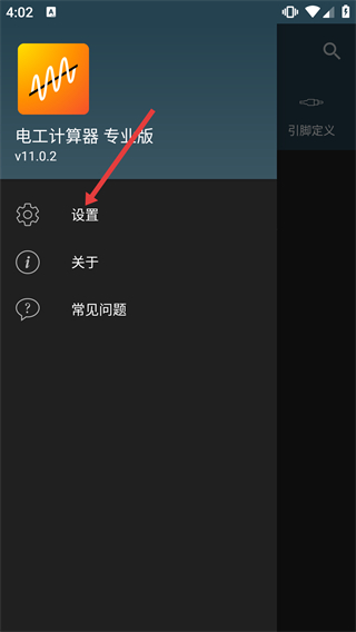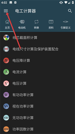 1、在電工計(jì)算器首頁,點(diǎn)擊左上角的菜單按鈕,打開功能側(cè)邊欄。
