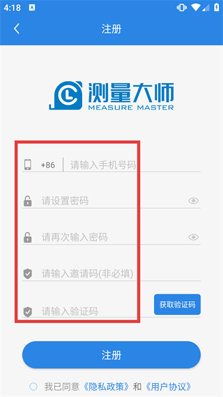 3、在【測量大師-MEASUREMASTER】注冊頁,依次填【手機號碼】【設(shè)置密碼】,選填邀請碼后獲取【驗證碼】待提交。