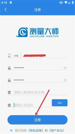 4、在【測量大師-MEASUREMASTER】注冊頁,勾選【我已同意-隱私政策-和-用戶協(xié)議】,再點擊【注冊】按鈕完成賬號創(chuàng)建。