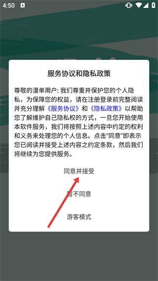 1、使用【漫單】前,需閱讀【服務協(xié)議】-【隱私政策】,選擇【同意并接受】可繼續(xù)使用,也能選【游客模式】臨時體驗。