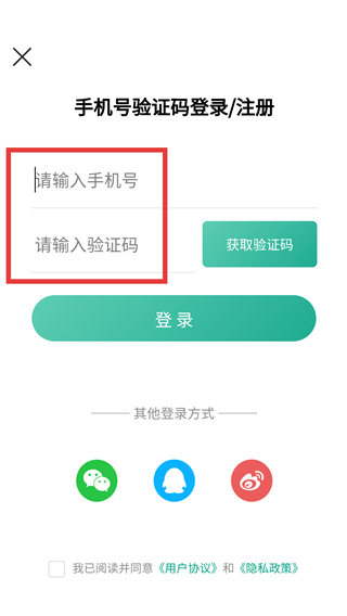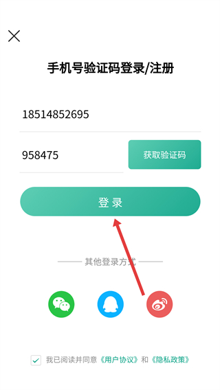 4、在【手機號驗證碼登錄/注冊】頁,填好【手機號】-【驗證碼】,勾選協(xié)議后點擊【登錄】按鈕,完成賬號登錄。