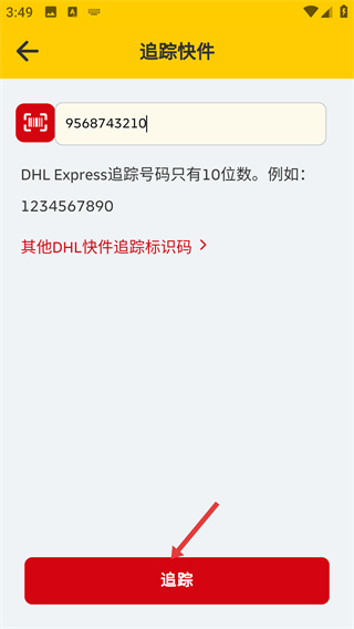 4、在【追蹤快件】頁面的輸入框中填寫【9568743210】,確認號碼準確后點擊【追蹤】按鈕,查詢該快件的物流流轉(zhuǎn)信息。