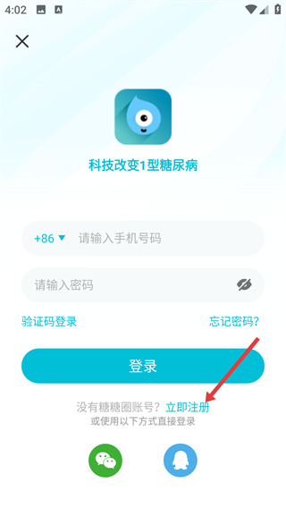 1、在【科技改變1型糖尿病】對應(yīng)的登錄頁面,找到【立即注冊】按鈕并點(diǎn)擊,進(jìn)入【糖糖圈】的賬號注冊流程。