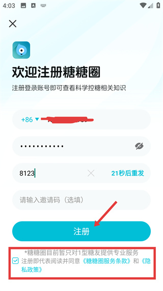 2、在【歡迎注冊糖糖圈】頁面,填寫信息后勾選【糖糖圈服務(wù)條款】與【隱私政策】,點(diǎn)擊【注冊】按鈕推進(jìn)注冊。
