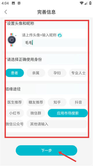 3、在【完善信息】頁面,完成【設(shè)置頭像和昵稱】、選擇身份等操作后,點(diǎn)擊【下一步】按鈕進(jìn)入后續(xù)流程。